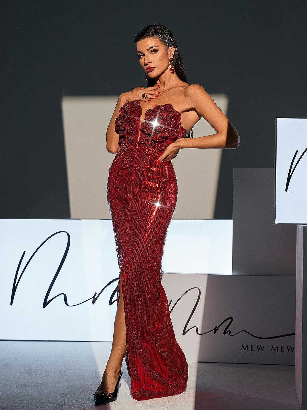 Lorelei Strapless Flower Sequin Split Dress In Wine