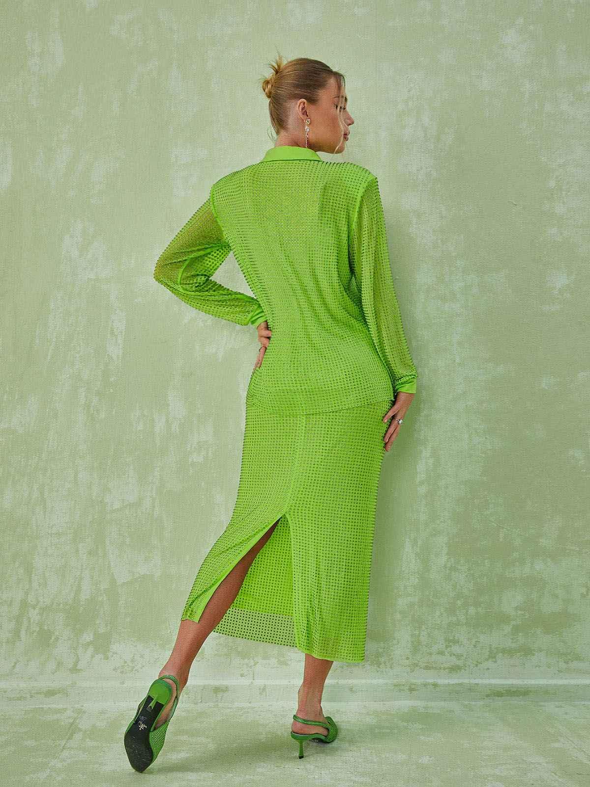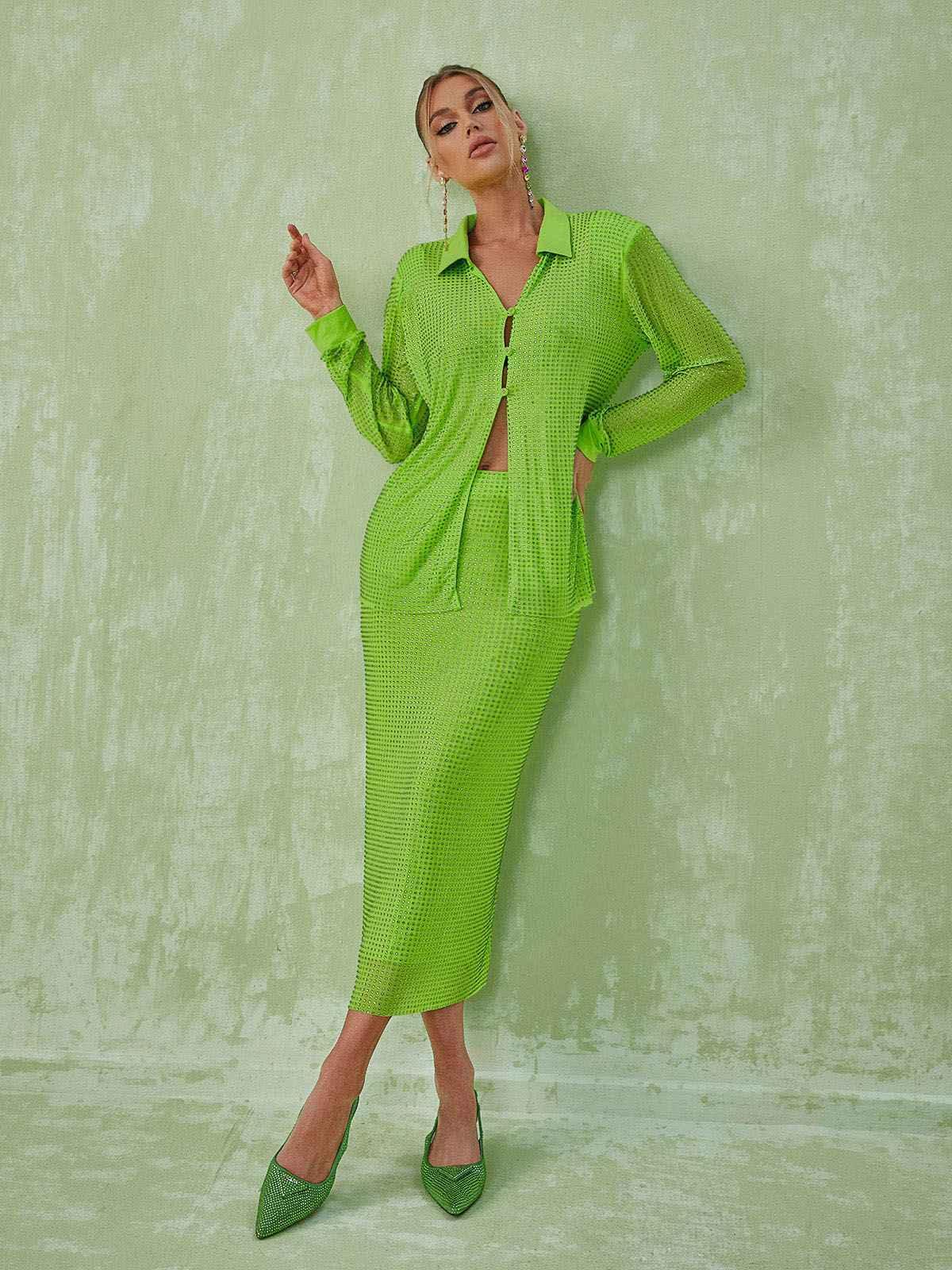 The Neriah Crystal Embellished Set is the perfect combination of comfort and style. Made with luxurious crystal embellishments, a long sleeve shirt, and midi skirt, this elegant set will make you stand out at any event.