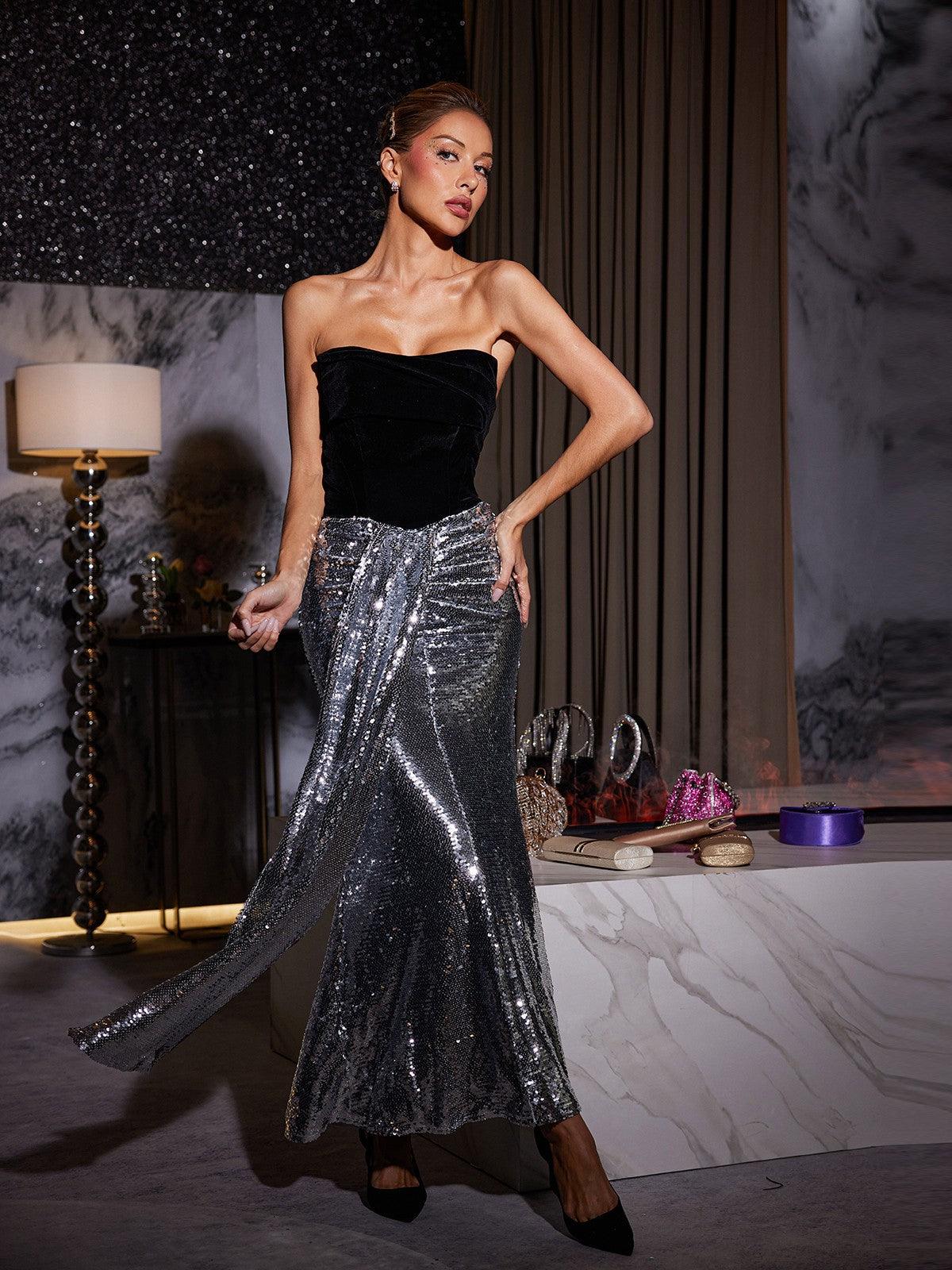 Be the center of attention in this stunning Shulamit Strapless Patchwork Sequin Dress. The intricate patchwork design and shimmering sequins make for an unforgettable look. Perfect for any special occasion, this dress exudes sophistication and exclusivity. Elevate your style with this luxurious piece.