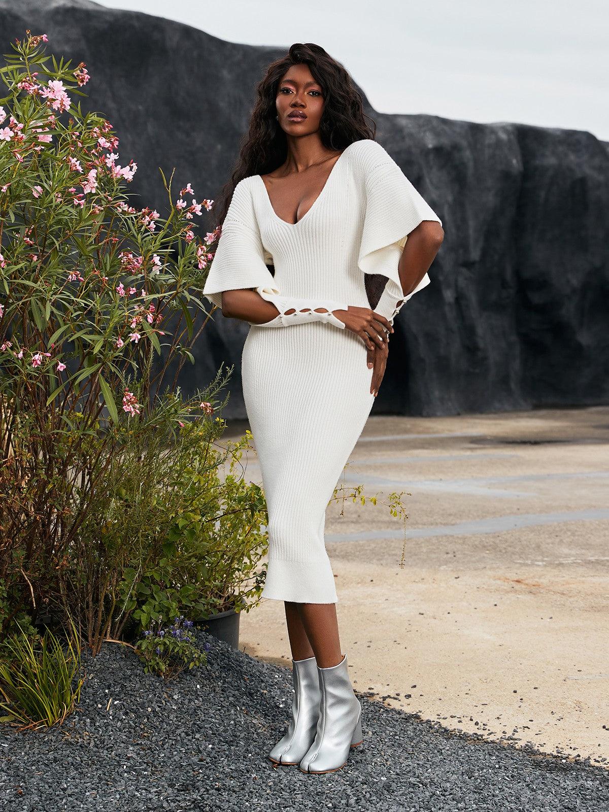 Look stunning in this Suri V Neck Hollow Knitted Dress In White. This beautiful dress is made from a soft and lightweight knit, featuring a flattering V-neckline and intricate detailing at the bodice. The perfect choice for any special occasion or night out!